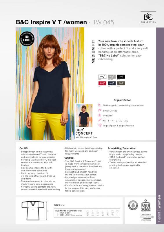 The cool and conscious ultra printable tee, offering an extremely soft hand feel and fashionable cut that fits perfectly, the B&C Inspire V T /women features a v-neck, short sleeves and side seams. Its high quality organic ringspun combed cotton and the 'B&C No label' solution esure personalisation excellence.100% Organic Cotton V-neck TEE by B&C fits perfectly, featuring a V-neck, short sleeves and side seamsThis luxury women's T-shirt is made of superior combed ring-spun organic cotton, with a very soft hand feelIts smooth and even surface provides the best blank canvas for printing Thanks to ″B&C No Label″ solution, it's perfect for rebrandingOffered in a wide variety of colours at a very affordable priceDUO Concept: a dedicated men's style for the perfect fitStripped back to the essentials, this short-sleeved T-shirt is clean and minimalistic for any occasionFor long-lasting comfort, the neck seams are reinforced with soft bindingSide seams ensure the best fit and a feminine silhouetteCut in an easy, medium fit, it's the kind of tee you'll dress up and downThin medium deep V collar rib for modern, up to date appearanceFor long-lasting comfort, the neck seams are reinforced with soft bindingMinimalist cut and detailing suitable for many uses and any end user requirementsThe V T-shirt is made from combed organic soft jersey with a luxurious hand feel and long-lasting comfort.Extra soft and smooth hand feel thanks to the ring-spun cottonCombed yarn ensures a finer, smoother, stronger, more compact, more uniform and cleaner fabricComfortable and snug to wear thanks to the organic thin yarn and dense fabric constructionVery smooth and even surface allows bright and crisp printing results″B&C No Label″ system for perfect rebrandingTested and approved for all standard printing techniques applicable on cotton.Accreditations: Amfori BSCI|Fair Wear Foundation|Organic 100 Content Standard|Oeko-Tex|Peta Approved Vegan|ReachAge Group: AdultFabric: 100% Pre-shrunk ringspun combed Organic or Organic In Conversion cottonGender: FemalePlus Size: NoProduct Type: T-ShirtsSize Range: XS to 2XLSizing To Fit: XS 8 S 10 M 12 L 14 XL 16 2XL 18/20Tag: TaglessWeight (GSM): 140gsm]]>