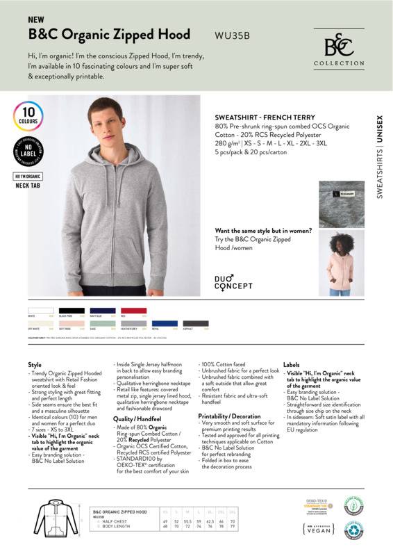 Hi, I'm organic! I'm the conscious zipped hoodie, I'm trendy, I'm available in fascinating colours and I'm super soft and exceptionally printable.Trendy organic zipped hooded sweatshirt with retail fashion oriented look and feelStrong styling with great fitting and perfect lengthSide seams ensure the best fit and a masculine silhouetteVisible ″Hi, I'm Organic″ neck tab to highlight the organic value of the garmentEasy branding solution - B&C No Label SolutionInside single Jersey halfmoon in back to allow easy branding personalisationQualitative herringbone neck tapeRetail like features: covered metal zip, single Jersey lined hood, qualitative herringbone neck tape and fashionable drawcord.Accreditations: Amfori BSCI|Fair Wear Foundation|Organic 100 Content Standard|Recycled Claim Standard - Blended|Oeko-Tex|Peta Approved Vegan|ReachAge Group: AdultFabric: 80% Ringspun combed cotton - Organic and Organic In Conversion, 20% Recycled PolyesterGender: MalePlus Size: YesProduct Type: HoodiesSize Range: S to 3XLSizing To Fit: S 36/38″ M 38/40″ L 41/42″ XL 43/44″ 2XL 45/47″ 3XL 49/51″Tag: TaglessWashing Instructions: Wash at 30 degrees ,no-bleach, no-dryer, iron-1, no-dry-clean.Weight (GSM): 280gsm]]>