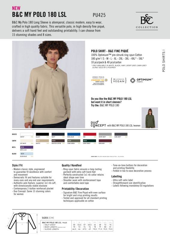 B&C My Polo 180 LSL has a timeless, classic modern style. Crafted in high-quality fabric, this is a long sleeve polo that’s easy to wear, its high-density fine piqué delivering a soft hand feel and outstanding printability.Modern classic style, engineered to guarantee fit excellence with comfort and movementDemocratic fit and features suitable for many uses and any end user requirementsAuthentic polo feature: superior 1x1 rib cuff, with dimensionally-stable elastaneContemporary two-button reinforced placketRingspun fabric ensures a long-lasting garment with extra-soft hand feelPerfectly constructed 1x1 rib collar retains ideal shape over timeShoulder seam with reinforcement tape and comfortable neck tapeSignature B&C fine piqué with even surface for bright, crisp printing resultsTested and approved for all standard printing techniques applicable on cottonTone-on-tone buttons for decoration and printing flexibilityFolded in box to ease decoration processUltra-soft satin labellingStraightforward size identificationLabels follow mandatory EU regulationsDuo concept.Accreditations: Amfori BSCI|Fair Wear Foundation|BCI (Better cotton initiative)|Oeko-Tex|Peta Approved Vegan|ReachAge Group: AdultFabric: 100% Optimium™ pre-shrunk ringspun cottonGender: MalePlus Size: YesProduct Type: PolosSize Exclusions: *4XL and 5XL only available in these colours.Size Range: S – 5XLSizing To Fit: S 34/36″ M 38/40″ L 40/42″ XL 44/46″ 2XL 48/50″ 3XL 50/52″ 4XL* 54/56″ 5XL* 56/58″Tag: Sewn TagWashing Instructions: Wash 40?C. Tumble dry 1 dot. Do not bleach. Do not dry clean. Iron 2 dots. Do not iron decoration.Weight (GSM): 180gsm]]>