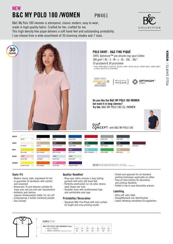 B&C My Polo 180 has a timeless, classic modern style – easy to wear, and crafted in high-quality fabric. This versatile women’s polo, in high-density fine piqué, delivers a soft hand feel and outstanding printability.Modern classic style, engineered to guarantee fit excellence with comfort and movementDemocratic fit and features suitable for many uses and any end user requirementsAuthentic polo feature: superior, dimensionally-stable 1x1 rib cuffContemporary two-button reinforced placketDuo conceptRingspun fabric ensures a long-lasting garment with extra-soft hand feelPerfectly constructed 1x1 rib collar retains ideal shape over timeShoulder seam with reinforcement tape and comfortable neck tapeSignature B&C fine piqué with even surface for bright, crisp printing resultsTested and approved for all standard printing techniques applicable on cottonTone-on-tone buttons for decoration and printing flexibilityFolded in box to ease decoration processUltra-soft satin labellingStraightforward size identificationLabels follow mandatory EU regulationsDuo concept.Accreditations: Amfori BSCI|Fair Wear Foundation|BCI (Better cotton initiative)|Oeko-Tex|Peta Approved Vegan|ReachAge Group: AdultFabric: 100% Optimium™ pre-shrunk ringspun cottonGender: FemalePlus Size: YesProduct Type: PolosSize Exclusions: *3XL only available in these colours.Size Range: XS – 3XLSizing To Fit: XS 8 S 10 M 12 L 14 XL 16 2XL 18 3XL* 20Tag: Sewn TagWashing Instructions: Wash 40?C. Tumble dry 1 dot. Do not bleach. Do not dry clean. Iron 2 dots. Do not iron decoration. Exception for Meta Gold: Wash 40?C. Do not tumble dry. Do not bleach. Do not dry clean. Iron 1 dot. Do not iron decoration.Weight (GSM): 180gsm]]>