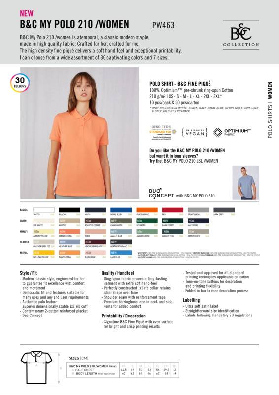 B&C My Polo 210 is a timeless, classic modern staple, made from high-quality fabric. Crafted for women, the high-density fine piqué delivers a soft hand feel and exceptional printability.Modern classic style, engineered to guarantee fit excellence with comfort and movementDemocratic fit and features suitable for many uses and any end user requirementsAuthentic polo feature: superior dimensionally stable 1x1 rib cuffContemporary two-button reinforced placketRingspun fabric ensures a long-lasting garment with extra-soft hand feelPerfectly constructed 1x1 rib collar retains ideal shape over timeShoulder seam with reinforcement tapePremium herringbone tape in neck and side vents for added comfortSignature B&C fine piqué with even surface for bright, crisp printing resultsTested and approved for all standard printing techniques applicable on cottonTone-on-tone buttons for decoration and printing flexibilityFolded in box to ease decoration processUltra-soft satin labellingStraightforward size identificationLabels following mandatory EU regulationsDuo concept.Accreditations: Amfori BSCI|Fair Wear Foundation|BCI (Better cotton initiative)|Oeko-Tex|Peta Approved Vegan|ReachAge Group: AdultFabric: 100% Optimium™ pre-shrunk ringspun cottonGender: FemalePlus Size: YesProduct Type: PolosSize Exclusions: *3XL only available in these colours.Size Range: XS – 3XLSizing To Fit: XS 8 S 10 M 12 L 14 XL 16 2XL 18 3XL* 20Tag: Sewn TagWashing Instructions: Wash 40?C. Tumble dry 1 dot. Do not bleach. Do not dry clean. Iron 2 dots. Do not iron decoration.Weight (GSM): 210gsm]]>