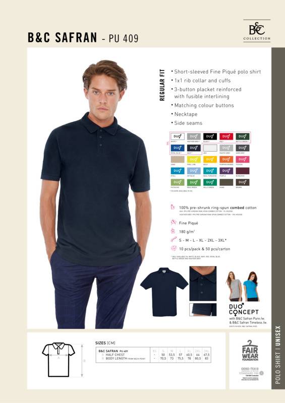 The B&C Safran polo shirt features the exclusive B&C Fine Piqué, made of 100% ringspun combed cotton, giving the best and smoothest surface for decoration and a luxurious appearance and handfeel. Its classic cut and superior quality details such as 1x1 rib knitted collar and cuffs and tone-on-tone 3-button placket make it the market reference in polo shirts. For the perfect duo, pair it with the B&C Safran Timeless /women or the B&C Safran Pure /women.Short sleeved polo shirt1x1 rib flat knitted collar and cuffsReinforced placket with 3 matching colour buttons.Accreditations: Amfori BSCI|Fair Wear Foundation|BCI (Better cotton initiative)|Oeko-Tex|Peta Approved Vegan|ReachAge Group: AdultFabric: Piqué, 100% Pre-shrunk ringspun combed cotton. Ash: 99% Pre-shrunk ringspun combed cotton, 1% Viscose. Heather Grey: 90% Pre-shrunk ringspun combed cotton, 10% ViscoseGender: MalePlus Size: YesProduct Type: PolosSize Exclusions: *3XL only available in these coloursSize Range: S to 3XLSizing To Fit: S 36/38″ M 38/40″ L 41/42″ XL 43/44″ 2XL 45/47″ 3XL* 47/49″Tag: Sewn TagWashing Instructions: Wash - 40. No - bleach. Dryer. Iron - 2. No - dry cleanWeight (GSM): 180gsm]]>