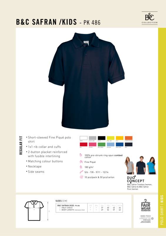 Featuring the exclusive B&C fine piqué, made of 100% ringspun combed cotton, the B&C Safran /kids short- sleeved polo shirt offers a perfectly smooth decoration surface and a luxurious appearance and handfeel. Its classic cut and superior quality details such as 1x1 rib knitted collar and cuffs and tone-on-tone 2-button placket combined with a wide colour palette and the right size range make it the perfect polo shirt for kids. The B&C Safran range also includes classic, pocket and long-sleeved versions and women’s versions.Short-sleeved polo shirtFlat knitted rib collar and cuffsReinforced placket with 2 matching colour buttons.Accreditations: Amfori BSCI|Fair Wear Foundation|BCI (Better cotton initiative)|Oeko-Tex|Peta Approved Vegan|ReachAge Group: KidsFabric: Piqué, 100% Pre-shrunk ringspun combed cottonGender: UnisexPlus Size: NoProduct Type: PolosSize Exclusions: * Size 12/14 is VATableSize Range: 5/6 to 12/14Sizing To Fit: 5/6 30″ 7/8 32″ 9/11 34″ 12/14 36″Tag: Sewn TagWeight (GSM): 180gsm]]>