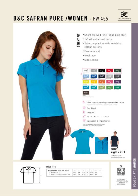 Featuring the exclusive B&C Fine Piqué, made of 100% ringspun combed cotton, the B&C Safran pure /women polo shirt offers a perfectly smooth decoration surface and a luxurious appearance and handfeel. Its purely feminine cut and superior quality details including 1x1 rib knitted collar and cuffs and tone-on-tone 2-button placket make it the perfect women’s polo shirt style. For the perfect duo, pair it with the B&C Safran.Skinny feminine cut, short-sleeved polo shirt1x1 flat knitted collar and cuffsFeminine placket with 2 matching colour buttonsDul style with SafranEnhanced printability thanks to the 100% ringspun combed cotton B&C fine piqué.Accreditations: Amfori BSCI|Fair Wear Foundation|BCI (Better cotton initiative)|Oeko-Tex|Peta Approved Vegan|ReachAge Group: AdultFabric: Fine piqué, 100% Pre-shrunk ringspun combed cotton. Heather Grey: 90% Pre-shrunk ringspun combed cotton, 10% ViscoseGender: FemalePlus Size: NoProduct Type: PolosSize Exclusions: *2XL only available in these coloursSize Range: XS to 2XLSizing To Fit: XS 8 S 10 M 12 L 14 XL 16 2XL* 18Tag: Sewn TagWashing Instructions: Wash - 40. No - bleach. Dryer. Iron - 2. No - dry cleanWeight (GSM): 180gsm]]>