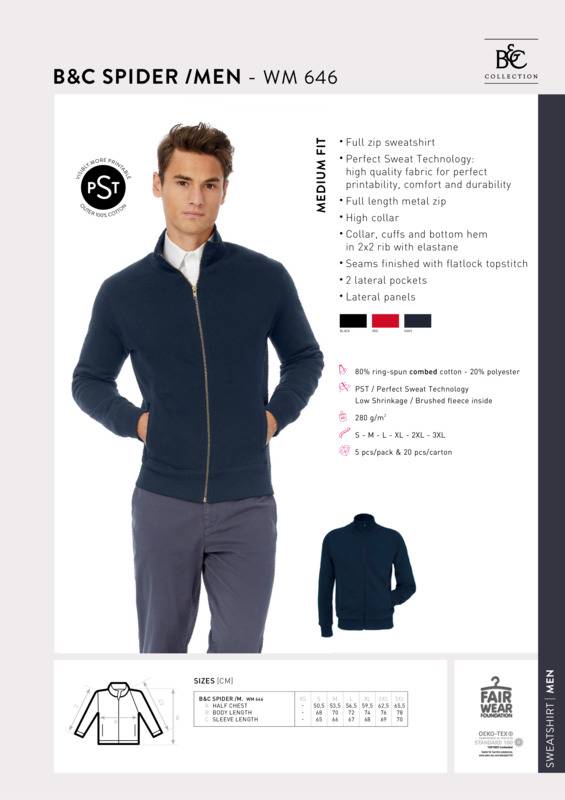 With our collection of sweatshirts and hoodies you’ll easily add an extra stylish layer to any outfit. The B&C Spider /men is a jacket made of PST sweatshirt fabric with a high standing collar in 2x2 rib, metal zip down the front, lateral pockets following the body panels for a neat look and body fit seams for comfort. Featuring B&C’s Perfect Sweat Technology, the B&C Spider /men sweatshirt is not just a high-end classic, it offers enhanced decoration outcomes thanks to its unique fabric construction that offers the best print results. On top, it has a luxurious, soft handfeel and quality matt appearance, combined with durability and great comfort. Grab this full-zipped sweatshirt whenever you need a little extra warmth and a touch of style. With B&C PST unique fabric construction you can let your inspiration free, confident of great decoration results.Full zip sweatshirtB&C Perfect Sweat Technology - high quality fabric for perfect printability, comfort and durabilityCollar, cuffs and hem in 2x2 rib with ElastaneSeams finished with flatlock topstitch2 lateral pockets.Accreditations: Amfori BSCI|Fair Wear Foundation|BCI (Better cotton initiative)|Oeko-Tex|Peta Approved Vegan|ReachAge Group: AdultFabric: 80% Combed cotton, 20% Polyester. Low shrinkage. Brushed fleece insideGender: MalePlus Size: YesProduct Type: SweatshirtsSize Range: S to 3XLSizing To Fit: S 36/38″ M 38/40″ L 41/42″ XL 43/44″ 2XL 45/47″ 3XL 47/49″Tag: Sewn TagWashing Instructions: Wash - 40. No - bleach. Dryer. Iron - 2. No - dry cleanWeight (GSM): 280gsm]]>