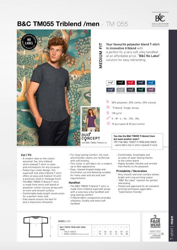 Your new favourite polyester blend T-shirt in innovative Triblend with a perfect fit, a very soft silky hand feel at an affordable price. B&C No Label solution for easy rebranding.My Favourite Triblend TEE by B&C fits perfectly, featuring a crew neck, short sleeves and side seamsThis supersoft men's T-shirt is made of innovative Triblend fabric which combines the benefits of its 3 components (polyester-cotton-viscose): it's breathable, durable, ultra soft and very resilientThe smooth, even surface makes it a perfect printing support for all printing techniquesThanks to ″B&C No Label″ solution, it's perfect for rebrandingOffered in a wide variety of solid and rich heather colours and sizes at a very affordable priceDUO Concept: a dedicated women's style for the A modern take on the classic essential Tee, this Triblend short-sleeved T-shirt is clean and minimalistic for any occasionFeaturing a clean design, this supersoft and silky Triblend t-shirt offers an easy and medium fit with a premium solid or melange finishThe T-shirt is made from extra-soft blend of polyester-cotton-viscose jersey with an even and smooth surfaceComfortable body length construction for a perfect retail lookSide seams ensure the best fit and a masculine silhouetteFor long-lasting comfort, the neck and shoulder seams are reinforced with soft bindingThin collar in self-fabric for a modern, up to date appearanceEasy, relaxeddraped shape and minimalist cut and detailing suitable for many uses and any end user requirementsHand feel; The B&C T-shirt is made from Triblend supersoft jersey with a luxurious silky hand feel and long-lasting comfort.Triblend fabric composition provides silkiness, fluidity and extra soft hand feelComfortable, breathable and an ease-of-wear feeling thanks to the cotton blendHighly durable, flexible and wrinkle free thanks to the polyesterPrintability/Decoration; Very smooth and even surface allows bright and crisp printing output″B&C No Label″ solution for perfect rebrandingTested and approved for all standard printing techniques applicable - ″Sublimation friendly″.Accreditations: Amfori BSCI|Fair Wear Foundation|BCI (Better cotton initiative)|Oeko-Tex|Peta Approved Vegan|ReachAge Group: AdultFabric: 50% Polyester, 25% Cotton , 25% ViscoseGender: MaleProduct Type: T-ShirtsSize Range: S to 3XLSizing To Fit: S 36/38″ M 38/40″ L 41/42″ XL 43/44″ 2XL 45/47″ 3XL 47/49″Tag: TaglessWashing Instructions: 40 degree wash. Do not bleach. Tumble dry low heat setting. Warm iron. Do not dry clean or remove stains with solvents.Weight (GSM): 130gsm]]>