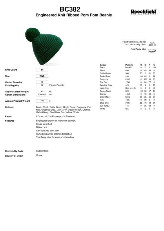 Technically designed to have a close-fitting crown, the engineered knit ribbed pom pom beanie utilises the latest innovations in product development. Comfortable, stylish and available in a medley of bright colours this beanie is perfect for hitting the slopes or your next autumnal adventure; and that’s not all, created from a single layer knit and with a convenient TearAway label, the options for personalisation and decoration are endless.TearAway label for ease of rebrandingEngineered crown for maximum comfortSelf-coloured pom pomRibbed knitSingle layer knitCuffed design for optimal decorationBSCI certifiedReach certified.Accreditations: Amfori BSCI|ReachAge Group: AdultFabric: 97% Acrylic, 2% Polyester, 1% ElastaneGender: UnisexPlus Size: NoProduct Type: BeaniesSize Range: OneSizeSizing To Fit: One sizeTag: Tear-outWashing Instructions: Hand wash only, do notiron, do not dry cleanWeight (GSM): 100g]]>