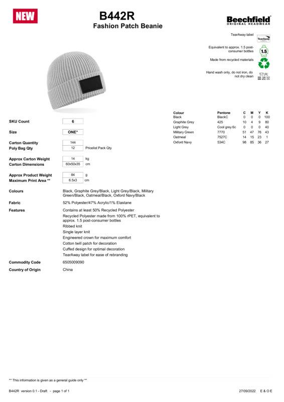 This classic cuffed beanie is embellished with a cotton twill patch – so when it’s time to make a style statement, you can wear it front and centre. B442R blends street style with utility vibes for hybrid headwear that needs to be on your radar. Keep comfort in check with an engineered crown, made for easy, effortless wear. Made with recycled polyester, B442R helps us move towards a more sustainable future.Contains at least 50% recycled polyesterRecycled polyester made from 100% rPET, equivalent to approx1.5 post-consumer bottlesRibbed knitSingle-layer knitEngineered crown for maximum comfortCotton twill patch for decorationCuffed design for optimal decorationTearAway label for easy rebranding.Age Group: AdultFabric: 52% Polyester, 47% Acrylic, 1% ElastaneGender: UnisexPlus Size: NoProduct Type: BeaniesSize Range: One sizeSizing To Fit: One sizeTag: Tear-awayWashing Instructions: Hand wash only. Do not iron. Do not dry clean.Weight (GSM): 84g]]>
