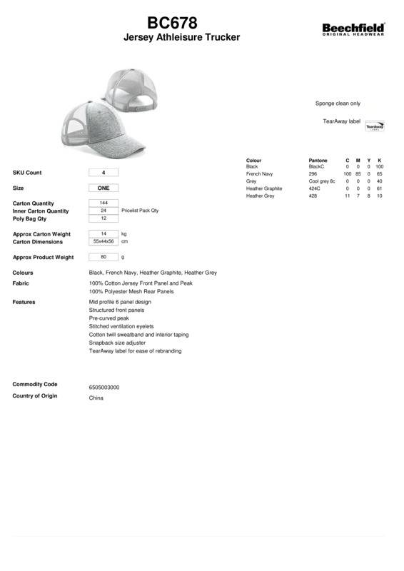 A 6-panel mid-profile design, the Jersey athleisure trucker is the perfect addition to any athleisure category. Part of an expanding range created to offer fashionable sportwear, the Jersey athleisure trucker offers style and well as practicality to any active lifestyle.TearAway label for ease of rebrandingMid profile 6-panel designStructured front panelsPre-curved peakStitched ventilation eyeletsCotton twill sweatband and interior tapingSnapback size adjusterREACH certifiedBSCI certified.Accreditations: Amfori BSCI|ReachAge Group: AdultFabric: 100% Cotton Jersey front panel and peak. Mesh rear panels: 100% PolyesterGender: UnisexPlus Size: NoProduct Type: CapsSize Range: OnesizeSizing To Fit: One sizeTag: Tear-outWashing Instructions: Sponge clean only.Weight (GSM): 80g]]>