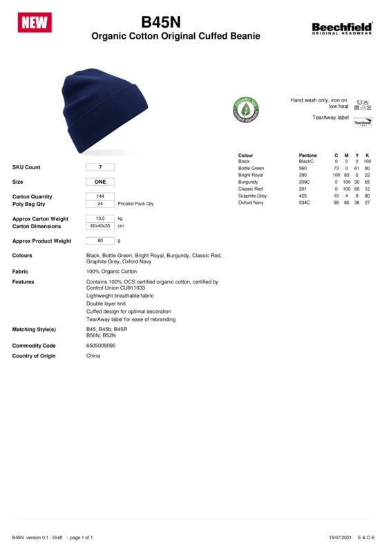 The B45N is based on the classic design of the BC045, which has been a mainstay for Beechfield® Original Headwear for over 25 years. Now available in 100% OCS certified organic cotton, the B45N is a comfortable, breathable design which is itch-free and cool to the skin. Not only that, but this style is also naturally sustainable and ultimately biodegradable, so will feel good for both your skin and the planet.Contains 100% OCS certified organic cotton, certified by Control Union CU811033Lightweight breathable fabricDouble-layer knitCuffed design for optimal decorationTearAway label for ease of rebranding.Accreditations: Organic 100 Content StandardAge Group: AdultFabric: 100% Organic cottonGender: UnisexPlus Size: NoProduct Type: BeaniesSize Range: One sizeSizing To Fit: One sizeTag: Tear-awayWashing Instructions: Hand wash only, iron on low heat.]]>