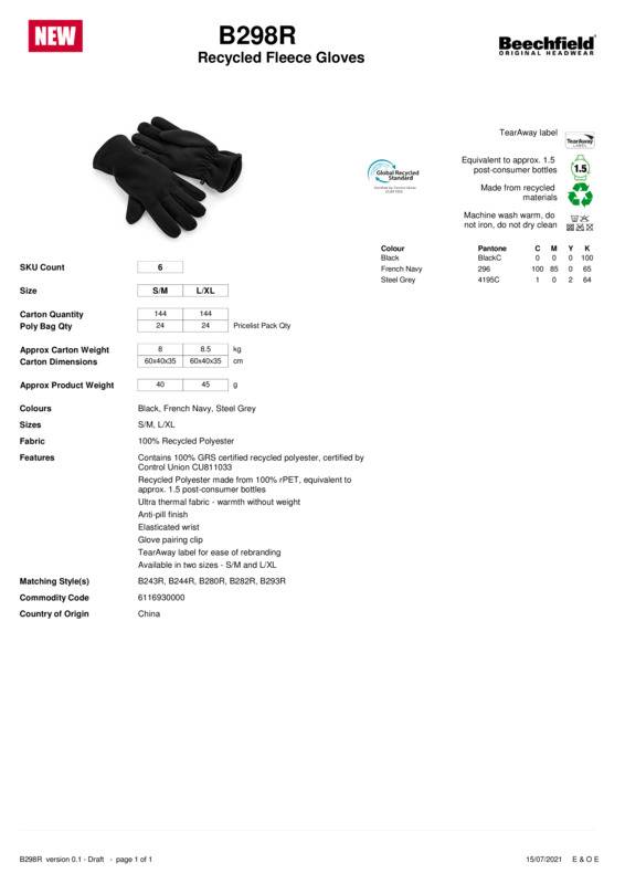 Made from 100% GRS certified recycled polyester, the equivalent of approximately 1.5 post-consumer plastic bottles, these well-fitting and highly-insulating gloves are a winter accessory essential. The short-pile, anti-pill fleece is soft to the touch, while an elasticated wrist and stretch fit ensures maximum comfort. This practical unisex design also features a connective clip for added convenience.Contains 100% GRS certified recycled polyester, certified by Control Union CU811033Recycled polyester made from 100% rPET, equivalent to approx1.5 post-consumer bottlesEquivalent to approx1.5 post-consumer bottlesUltra thermal fabric – warmth without weightAnti-pill finishElasticated wristPairing clipTearAway label for ease of rebranding.Age Group: AdultFabric: 100% Recycled polyesterGender: UnisexPlus Size: NoProduct Type: GlovesSize Range: S/M – L/XLSizing To Fit: S/M L/XLTag: Tear-awayWashing Instructions: Machine wash warm, do not iron, do not dry clean.]]>