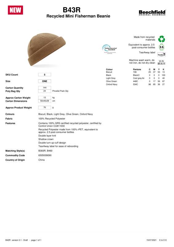 Once reserved solely for workwear-inspired looks, the mini fisherman beanie has evolved into a popular street style essential. This mini pull-on style, featuring a double turn-up cuff, is a close-fitting beanie designed to sit on top of the head, just above the ears. Made from 100% GRS certified recycled polyester, this neat design is perfect as both a sustainable and a fashionable choice.Contains 100% GRS certified recycled polyester, certified by Control Union CU811033Recycled polyester made from 100% rPET, equivalent to approx2.5 post-consumer bottlesEquivalent to approx2.5 post-consumer bottlesDouble-layer knitDouble turn-up cuff design for optimal decorationShallow crownTearAway label for ease of rebranding.Accreditations: Global Recycled StandardAge Group: AdultFabric: 100% Recycled polyesterGender: UnisexPlus Size: NoProduct Type: BeaniesSize Range: One sizeSizing To Fit: One sizeTag: Tear-awayWashing Instructions: Machine wash warm, do not iron, do not dry clean.]]>