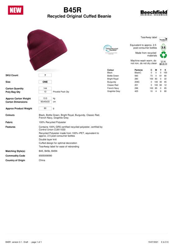 A new sustainable take on the Beechfield® Classic original cuffed beanie is the BC45R which is made from 100% GRS certified recycled polyester. By using recycled-polyester yarn, we are helping to reduce waste and lessen the use of oil-based raw materials. The BC45R is a circular knitted, soft ribbed style with minimal detailing and a simple turn-up, perfect for decoration. This warm and comfortable double layer beanie is the ideal, conscious choice for both your everyday and outdoor adventures.Contains 100% GRS certified recycled polyester, certified by Control Union CU811033Recycled polyester made from 100% rPET, equivalent to approx2.5 post-consumer bottlesEquivalent to approx2.5 post-consumer bottlesDouble-layer knitCuffed design for optimal decorationTearAway label for ease of rebranding.Accreditations: Global Recycled StandardAge Group: AdultFabric: 100% Recycled polyesterGender: UnisexPlus Size: NoProduct Type: BeaniesSize Range: One sizeSizing To Fit: One sizeTag: Tear-awayWashing Instructions: Machine wash warm, do not iron, do not dry clean.]]>