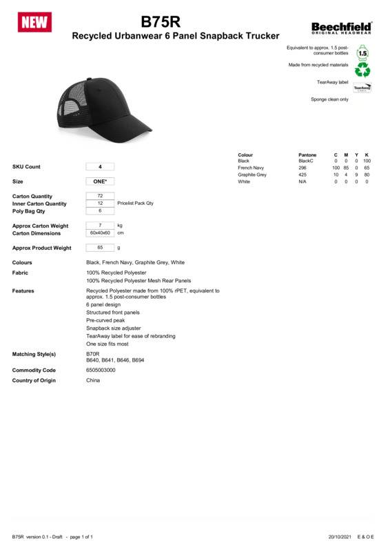 Made with 100% GRS certified recycled polyester, equivalent to approximately 1.5 post-consumer plastic bottles, the BC75R is a stylish and sustainable addition to any collection. Its sustainable credentials include its breathable, recycled polyester mesh rear panels. The 6 Panel design features a pre-curved peak and structured front panels, as well as a snapback size adjuster for maximum comfort.Recycled Polyester made from 100% rPET, equivalent to approximately 1.5 post-consumer bottles6-panel designStructured front panelsPre-curved peak, Snapback size adjusterTearAway label for ease of rebrandingOne size fits mostBSCI certifiedReach certified.Accreditations: Amfori BSCI|ReachAge Group: AdultFabric: 100% Recycled polyester. 100% Recycled polyester mesh rear panelsGender: UnisexPlus Size: NoProduct Type: CapsSize Range: One sizeSizing To Fit: One sizeTag: Tear-awayWashing Instructions: Sponge clean onlyWeight (GSM): 65g]]>