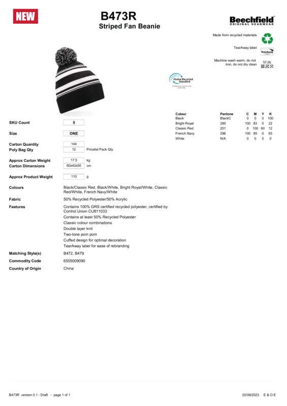 Bring this hat to life with the logo and colours of any team. The Striped fan beanie comes in a variety of colour combinations, topped with a matching decorative pom pom. It has an engineered crown for a snug fit and a ribbed cuff that can be adjusted for ultimate comfort. Style with a scarf and gloves for those chilly stadium days.Contains 100% GRS certified recycled polyester, certified by Control Union CU811033, and at least 50% recycled polyesterClassic colour combinationsDouble-layer knitTwo-tone pom pomCuffed design for optimal decorationTearAway label for ease of rebranding.Accreditations: Global Recycled StandardAge Group: AdultFabric: 50% Recycled polyester, 50% AcrylicGender: UnisexPlus Size: NoProduct Type: BeaniesSize Range: One sizeSizing To Fit: One sizeTag: Tear-awayWashing Instructions: Machine wash warm, do not iron, do not dry cleanWeight (GSM): 110g]]>