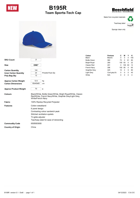 Boost team spirit with this classic six-panel cap. A cotton sweatband ensures complete comfort, while a contrasting colour sandwich peak creates a trendy collegiate finish. This is the perfect piece for personal sports styling or athleisurewear, as well as a great gifting opportunity for sports events, contests and fan clubs. Available in a wide range of colourways, there’s sure to be something to complement any kit – and, containing 100% recycled polyester, it’s another step towards a more sustainable era. Contains 100% GRS certified recycled polyester, certified by Control Union CU8110336-panel designCotton sweatbandContrasting colour sandwich peak and ventilation eyeletsTri-glide adjusterTearAway label for ease of rebranding.Accreditations: Global Recycled StandardAge Group: AdultFabric: 100% Ripstop recycled polyesterGender: UnisexPlus Size: NoProduct Type: CapsSize Range: One sizeSizing To Fit: One sizeTag: Tear-awayWashing Instructions: Sponge clean only.Weight (GSM): 70g]]>