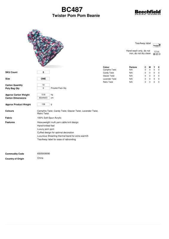 The twister pom pom beanie gives casual headwear an instant colour pop just in time for the cold weather. This Alpine-ready beanie includes a choice of seasonal colour palettes, each with a heavyweight multi-yarn cable knit design and luxury pom pom detail. The cuffed design and tear-out label also offers numerous decorative options.Tear-out label for ease of rebrandingHeavyweight multi yarn cable knit designHand-knitted feelLuxury pom pomLuxurious shearling thermal band for extra warmthCuffed design for optimal decorationBSCI certifiedReach certified.Accreditations: Amfori BSCI|ReachAge Group: AdultFabric: 100% Soft-touch acrylicGender: UnisexProduct Type: BeaniesSize Range: OnesizeSizing To Fit: One sizeTag: Tear-outWeight (GSM): 138g]]>