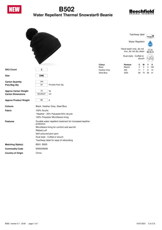 Outdoor adventures call for multifunctional headwear, which makes the BC502 an absolute essential. The microfleece lining maintains comfort and warmth, while a durable water-repellent treatment boosts this versatile beanie’s weather-resistant credentials. The ribbed cuff can be turned down for a slouchy fit and its self-coloured pom pom completes the look. A technical addition to the best-selling Snowstar® collection.Durable water-repellent treatment for increased weather protectionRibbed cuffDual style – cuffed or slouchSelf-coloured pom pomMicrofleece lining for comfort and warmthTearAway label for ease of rebrandingReach certified.Accreditations: ReachAge Group: AdultFabric: 100% Acrylic. Heather: 55% Polyester, 45% Acrylic. Microfleece lining: 100% PolyesterGender: UnisexPlus Size: NoProduct Type: BeaniesSize Range: One sizeSizing To Fit: One sizeTag: Tear-awayWashing Instructions: Hand wash only, do not iron, do not dry clean.]]>