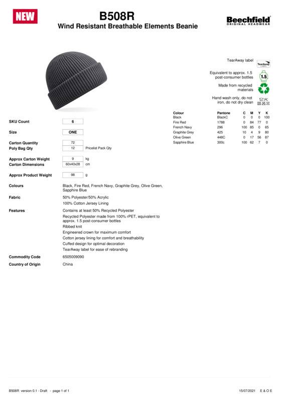 Perfect for the changing seasons, the B508R provides warmth without being too heavy, thanks to its breathable cotton jersey lining. A ribbed exterior completes the classic chunky knit look and helps keep the chill out. The cuffed design provides optimal opportunity for decoration, and an engineered crown is designed with maximum comfort in mind. Made with 50% recycled polyester content – the equivalent of approximately 1.5 post-consumer bottles.Contains at least 50% recycled polyesterEquivalent to approx1.5 post-consumer bottlesRibbed knitEngineered crown for maximum comfortCotton Jersey lining for comfort and breathabilityWide cuffed design for optimal decorationTearAway label for ease of rebrandingBSCI certifiedReach certified.Accreditations: Amfori BSCI|ReachAge Group: AdultFabric: 50% Polyester, 50% Acrylic. 100% Cotton Jersey liningGender: UnisexPlus Size: NoProduct Type: BeaniesSize Range: One sizeSizing To Fit: One sizeTag: Tear-awayWashing Instructions: Hand wash only, do not iron, do not dry clean.]]>
