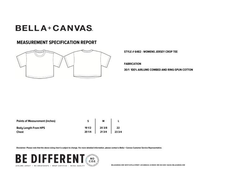 This Jersey crop tee slides right into on-trend streetwear style for summer. With oversized sleeves and a relaxed body,it drops a little lower in the back for an effortlessly cool feel. Fabricated from ultra-soft, lightweight Airlume cotton to flatter, this looser crop features a finished hem and neck binding.Side-seamedDrop shoulder fitTear-away labelCertified WRAP.Accreditations: WRAPAge Group: AdultFabric: 100% Airlume combed and ringspun cottonGender: FemalePlus Size: NoProduct Type: T-ShirtsSize Range: S – XLSizing To Fit: S 10 M 12 L 14 XL 16Tag: Tear-awayWashing Instructions: Machine wash warm, inside out with similar colours. Non-chlorine bleach only. Do not tumble dry. Do not iron decoration.Weight (GSM): 145gsm]]>
