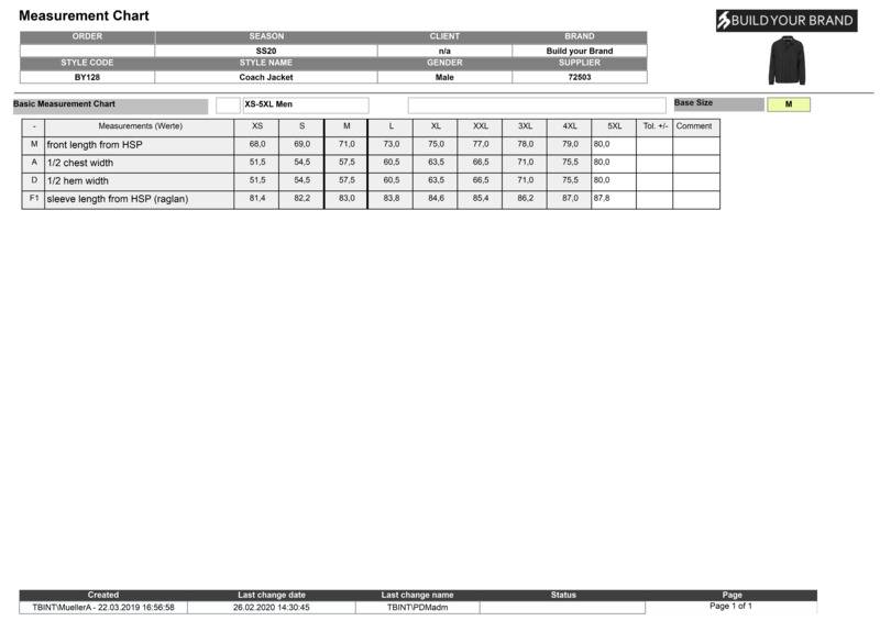 This sporty coach jacket pleases with a simple and functional design, which can be further enhanced through stitching, silk screening or flock printing. Its raglan cut with seamless shoulders in combination with the continuous press-button facing as well as the elastic cuffs turn this nice piece of garment into a real street wear style jacket. You will also get some handy side pockets and an elastic waistband with drawstring and stoppers at your disposal. The sophisticated design is rounded off by a simple yet elegant collar. The functional and robust upper is made of nylon, the lining out of cotton and taffeta.CollarSet-in sleeveWelt pocketThis item is manufactured in a FAMA certified factoryFAMA stands for Facility and Merchandise Authorization and is a high-standard production certificate which is needed to produce Disney certified productsCertified amfori BSCI and Disney FAMA.Accreditations: Amfori BSCI|FAMAAge Group: AdultFabric: Shell: 100% Nylon and polyamide, 260T. Lining 1: 100% Cotton, single Jersey. Lining 2: 100% Polyester, 230T, taffetaGender: MalePlus Size: YesProduct Type: JacketsSize Range: XS – 5XLSizing To Fit: XS 40″ S 42″ M 46″ L 48″ XL 50″ 2XL 52″ 3XL 56″ 4XL 60″ 5XL 62″Tag: Tear-outWashing Instructions: Machine wash 30°C easycare. Do not bleach. Do not hot iron. Do not tumble dry. Do not dry clean.Weight (GSM): Shell: 88gsm. Lining 1: 11gsm. Lining 2: 70gsm]]>