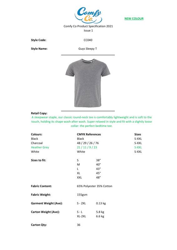 Give your loungewear an upgrade with our guys sleepy T which features a crew neckline and short set-in sleeves.Relaxed fit T for maximum comfortSelf-fabric crew neckSelf-fabric taped back neckTwin needle stitching detailSet in sleeveLightweight fabricEasy tear out back neck label makes it perfect for rebrandingWRAP certifiedBSCI certifiedOeko-Tex certifiedSEDEX certified.Accreditations: Amfori BSCI|Oeko-Tex|Sedex|WRAPAge Group: AdultFabric: 65% Polyester, 35% CottonGender: MalePlus Size: NoProduct Type: T-ShirtsSize Range: S to 2XLSizing To Fit: S 38″ M 40″ L 43″ XL 45″ 2XL 48″Tag: Tear-outWashing Instructions: Machine wash 30°. Do not bleach. Tumble dry low heat. Low iron. Do not dry cleanWeight (GSM): 155gsm]]>