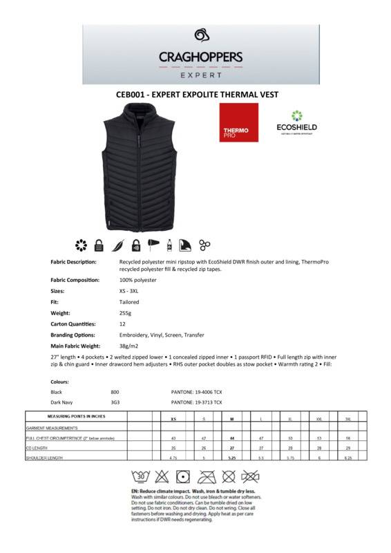 A wonderful workwear option for effective insulation. Expolite channels down-like ThermoPro synthetic fill into slender baffles that help create instant warmth. Four neat zipped pockets, one with RFID protection. Easy to transport, stuffed into its own stow pocket.Water-resistant padded vest, with a full-length zip and 4 pockets, one of which doubles as a stow pocketRecycled polyester mini ripstop with EcoShield DWR finish outer and liningThermoPro recycled polyester fill and recycled zip tapes4 pockets: 2 welted zipped lower, 1 concealed zipped inner and 1 passport RFID.Age Group: AdultFabric: 100% PolyesterGender: UnisexPlus Size: YesProduct Type: Gilets & Body WarmersSize Range: XS to 3XLSizing To Fit: XS 36″ S 38″ M 40″ L 43″ XL 46″ 2XL 49″ 3XL 52″Tag: Sewn TagWashing Instructions: Wash with similar colours. Do not use bleach or water softeners. Can be tumble dried on a low setting. Do not iron. Do not dry clean. Do not wring. Close all fasteners before washing and drying. Apply heat as per care instructions if DWR needs regenerating.Weight (GSM): 38gsm]]>