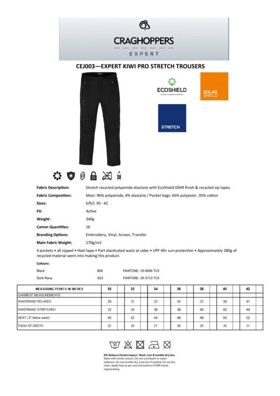 Agile outdoor trousers that perform brilliantly in active workwear environments. The full-stretch fabric incorporates effective UV protection and features an EcoShield water-repellent finish to shrug off splashes, making these Kiwis a cinch to look after. Featuring 4 zipped pockets and part-elasticated waist.Stretch trousers with water-resistant finish, featuring 4 pocketsStretch recycled polyamide elastane with EcoShield DWR finish100% recycled zip tapesUPF 40+ sun protection and SolarShield technologyEN1378-2.Age Group: AdultFabric: Main: 96% Polyamide, 4% Elastane. Pocket bags: 65% Polyester, 35% CottonGender: MaleLeg Length: Leg length: Short 29″, Regular 31″, Long 33″Plus Size: YesProduct Type: TrousersSize Range: 30S to 42LSizing To Fit: 30″ 32″ 34″ 36″ 38″ 40″ 42″Tag: Sewn TagWashing Instructions: Wash with similar colours. Do not use bleach or water softeners. Can be tumble dried on a low setting. Cool iron, if needed. Do not dry clean. Apply heat as per care instructions if DWR needs regenerating.Weight (GSM): 170gsm]]>