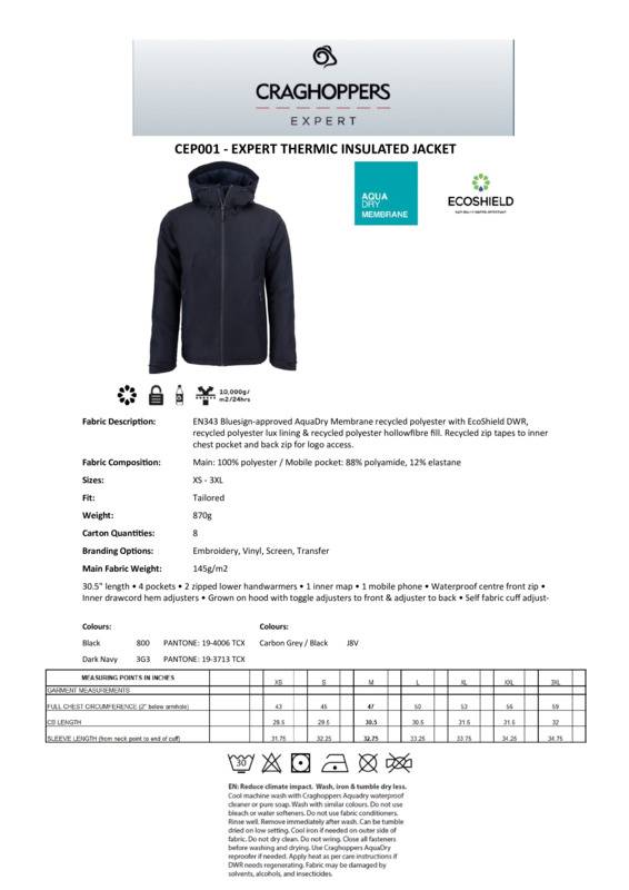 Unisex thermic jacket that will give you the confidence to brave the wind, rain and snow on the outdoor trail. The AquaDry membrane waterproof construction is paired with a layer of insulating hollowfibre fill, hood and a snug lux lining for extra warmth where you need it. A total of 4 pockets, including handwarmer ‘hot pockets’ which provide ample on-board storage.Insulated waterproof and breathable jacket with a full-length zip and 4 pockets10,000mm waterproofRecycled polyester lux lining and recycled polyester hollowfibre fillRecycled zip tapes to inner chest pocket and back zip for logo access.Age Group: AdultFabric: Main: 100% Polyester. Mobile pocket: 88% Polyamide, 12% ElastaneGender: UnisexPlus Size: YesProduct Type: JacketsSize Range: XS to 3XLSizing To Fit: XS 36″ S 38″ M 40″ L 43″ XL 46″ 2XL 49″ 3XL 52″Tag: Sewn TagWashing Instructions: Cool wash with Craghoppers AquaDry waterproof cleaner or pure soap. Wash with similar colours. Do not use bleach or water softeners. Do not use fabric conditioners. Rinse well. Remove immediately after wash. Can be tumble dried on a low setting. Cool iron, if needed, on the outer side of the fabric. Do not dry clean. Do no wring. Close all fasteners before washing and drying. Use Craghoppers AquaDry reproofer if needed. Apply heat as per care instructions if DWR needs regenerating. Fabric may be damaged by solvents, alcohols and insecticides.Weight (GSM): 145gsm]]>