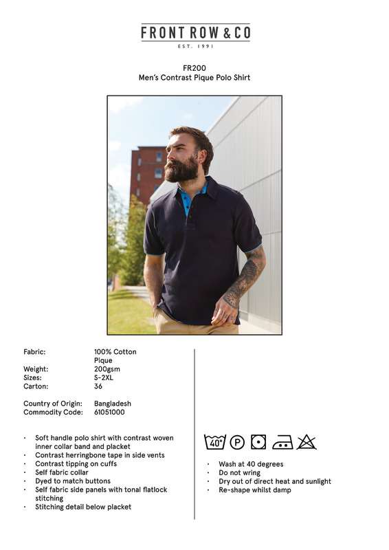 A stylish variation of the standard polo shirt with contrast woven inner collar band, placket and side vents. Tipped sleeves and flat-lock stitching further elevates this premium quality style. Every day brings a chance to make a change; take an exciting new direction with Front Row.Piqué polo with self fabric side panelsTonal flat lock stitch detail on panel seamsContrast woven placket and inner collar bandSelf fabric collarZigzag contrast stitching on placket boxContrast herringbone tape in side ventsContrast tipping on cuffs4 button placket with dyed to match buttonsSEDEX certifiedOeko-Tex certifiedBSCI certified.Accreditations: Amfori BSCI|Oeko-Tex|SedexAge Group: AdultFabric: 100% Cotton piquéGender: MalePlus Size: NoProduct Type: PolosSize Range: S to 2XLSizing To Fit: S 36/38″ M 38/40″ L 42″ XL 44/46″ 2XL 48″Tag: Sewn TagWashing Instructions: 40 cotton. Do not bleach. Tumble dry on low. 2 dot iron. P dry clean. Wash at 40 degrees. Wash dark colours separately. Re-shape while damp. Dry out of direct heat and sunlight. Do not leave folded when damp. Iron on reverse. Wash and Dry Inside Out. Dry out of direct heat and sunlight.Weight (GSM): 200gsm]]>