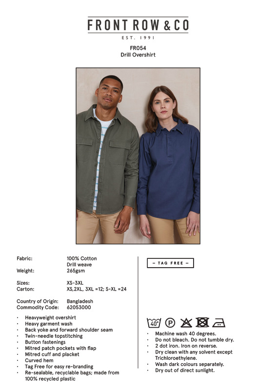 For the carefree; those with a youthful spirit; those who work hard and play harder. This trend-led overshirt has no restrictions. Garment washed, this shacket is made up in durable drill weave, ready to take on workwear and streetwear. Clean mitred cuff and placket are completed with button fastenings paired with oversized mitred patch pockets. Ready to be rebranded, it comes tag-free.Heavyweight overshirtHeavy garment washBack yokeTwin-needle topstitchingPlastic horn-effect buttonsMitred patch pockets with flapMitred cuff and placket with button fasteningCurved hemForward shoulder seamTag-free for easy rebrandingSEDEX certifiedBSCI certified.Accreditations: Sedex|Amfori BSCIAge Group: AdultFabric: 100% Cotton drill weaveGender: MalePlus Size: YesProduct Type: ShirtsSize Range: XS to 3XLSizing To Fit: XS 34/36″ S 36/38″ M 38/40″ L 42″ XL 44/46″ 2XL 48″ 3XL 50/52″Tag: TaglessWashing Instructions: Machine wash 40°. Do not bleach. 2 dot iron. Do not tumble dry. Dry clean with any solvent except Trichloroethylene. Iron on reverse. Wash dark colours separately. Dry out of direct sunlight.Weight (GSM): 265gsm]]>
