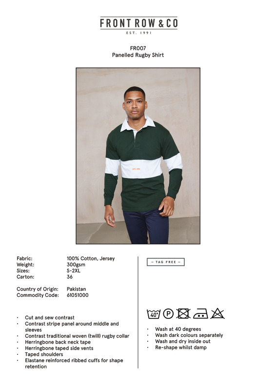It's the year of the rugby revival; this tag free rugby shirt is perfect for everyone from fashion brands to traditional clubs. Made from high quality heavyweight Jersey, this on-trend panelled shirt has a traditional woven rugby collar with cotton webbing and is ready to display a bold slogan, logo or crest. The front row in rugby; the front row in fashion.Tag free retro fit rugby shirtCut and sew contrast stripe panel around centreHeavyweight single JerseyContrast traditional woven (twill) rugby collarHerringbone back neck tapeContrast herringbone taped side ventsTaped shouldersElastane reinforced ribbed cuffs for shape retentionTwin-needle hemTopstitching at armholes and panelsConcealed button placketHerringbone inner placket2 x rubber buttonsWRAP certified.Accreditations: WRAPAge Group: AdultFabric: 100% Ringspun cotton heavyweight single JerseyGender: UnisexPlus Size: NoProduct Type: PolosSize Range: S to 2XLSizing To Fit: S 36/38″ M 38/40″ L 42″ XL 44/46″ 2XL 48″Tag: TaglessWashing Instructions: 40 Cotton. Wash at 40 degrees. Do not bleach. Do not tumble dry. 2 dot iron. Professional dry clean. Wash dark colours separately. Re-shape whilst damp. Do not leave folded when damp. Dry out of direct heat and sunlight. Iron on reverse of decoration.Weight (GSM): 300gsm]]>