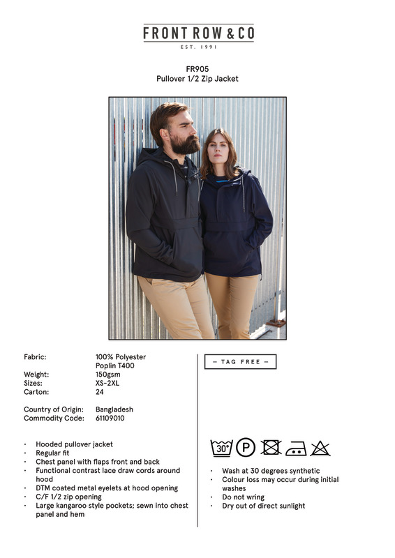 For the carefree. For those with a youthful spirit. For those who work hard and play harder. This on-trend hooded pullover jacket with showerproof fabric and mesh lining features a pouch pocket, side seam opening with drawcord hem, embroidery access and contrast drawcords. Great looking leisurewear. Thoughtfully created.Hooded pullover jacketRegular fitChest panel, front and backShowerproof fabric, with mesh liningPart-elasticated cuffs3-piece hoodFunctional contrast lace drawcords around hoodCoated metal eyelets at hood openingCentre front half- zip openingTextured zip puller, with cordSelf-fabric storm flap, with hook and loop fasteningElasticated cord through inside hem, with plastic togglesSide-seam zip-opening, left hand side as wornLarge kangaroo style pocketsInside patch pocket (with hook and loop fastening)Internal embroidery accessBack neck hanging loop.Accreditations: Amfori BSCIAge Group: AdultFabric: 100% Polyester T400Gender: MalePlus Size: YesProduct Type: JacketsSize Range: XS to 2XLSizing To Fit: XS 34/36″ S 36/38″ M 38/40″ L 42″ XL 44/46″ 2XL 46/48″Tag: TaglessWashing Instructions: Do not bleach. Do not tumble dry. 2 dot iron. Do not dry clean. Wash at 40 degrees. Wash dark colours separately. Re-shape whilst damp. Do not leave folded when damp. Dry out of direct heat and sunlight. Iron on reverse of decoration.Weight (GSM): 150gsm]]>