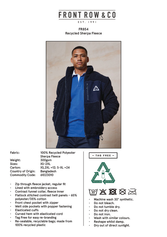 Making a bold statement, Front Row’s sherpa fleece is a pioneer. Crafted from 100% recycled polyester, it’s made for the great outdoors. Retail-inspired thick pile sherpa fleece is perfect for everyone from fashion brands to traditional clubs. Made tag-free, the lining is equipped with embroidery access for adding eye-catching decoration.Zip-through fleece jacket, regular fitLined with embroidery accessContrast funnel collar, fleece innerFlatlock-stitched contrast panels – 100% cotton twillFront chest pocket with zipWelt side pockets with popper fasteningElasticated cuffsCurved hem with elasticated cordTag-free for easy rebrandingBSCI certifiedOeko-Tex certifiedSEDEX certified.Accreditations: Sedex|Amfori BSCI|Oeko-TexAge Group: AdultFabric: 100% Recycled polyester, 65% Polyester / 35% Cotton Twill PanellingGender: UnisexPlus Size: NoProduct Type: FleeceSize Range: XS to 2XLSizing To Fit: XS 34/36″ S 36/38″ M 38/40″ L 42″ XL 44/46″ 2XL 48″Tag: TaglessWashing Instructions: Machine wash 30° synthetic. Do not bleach. Do not tumble dry. Do not dry clean. Do not iron. Wash with similar colours. Reshape whilst damp. Dry out of direct sunlight.Weight (GSM): 300gsm]]>