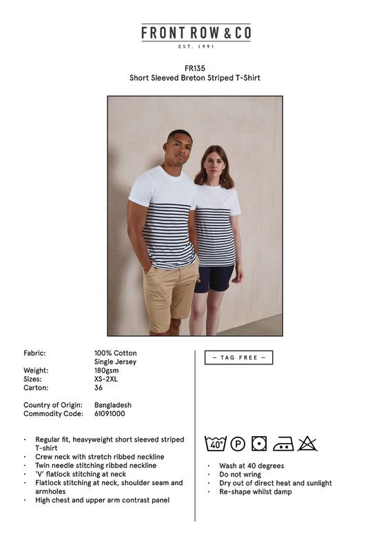 The short sleeved Breton T features a plain chest panel and sleeve panel - allowing for even more decorating opportunities and is tag free for easy re-branding. Flatlock stitching and a stretch rib neck ensures the premium quality finish Front Row & Co. is known for.Tag free regular fit, heavyweight short sleeved t-shirtCrew neck with stretch ribbed necklineTwin-needle stitching at cuffs and hem'V' flatlock stitching detail at neckFlatlock stitching at neck, shoulder seam and armholesHigh chest seamStriped lower body; contrast plain upper body and sleevesCoordinates with FR134 long sleeved Breton TSEDEX certifiedOeko-Tex certifiedBSCI certified.Accreditations: Amfori BSCI|Oeko-Tex|SedexAge Group: AdultFabric: 100% Cotton single JerseyGender: UnisexPlus Size: NoProduct Type: T-ShirtsSize Range: XS to 2XLSizing To Fit: XS 34/36″ S 36/38″ M 38/40″ L 42″ XL 44/46″ 2XL 48″Tag: TaglessWashing Instructions: 40 Cotton. Do Not Bleach. 2 dot iron. Professional dry clean. Wash at 40 degrees. Wash dark colours separately. Re-shape whilst damp. Do not leave folded when damp. Tumble dry low. Dry out of direct heat and sunlight. Iron on reverse of decoration.Weight (GSM): 180gsm]]>