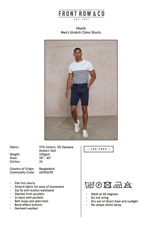 The epitome of smart casual, Front Row's lightweight stretch chino range is for teams, clubs and workplaces. For brands looking to put their names to quality garments. For those who work hard and play harder. These flat front chino shorts are made with quality cotton-rich stretch twill, and are garment washed for a comfortable finish. Constructed with a YKK zip fly and buttoned waistband. Tag free for easy rebranding. Great looking leisurewear. Thoughtfully created.Flat front chino short, tag free, stretch fabric for ease of movementSlanted front pockets, 2 back welt pockets, belt loops plain hemBSCI certified.Accreditations: Amfori BSCIAge Group: AdultFabric: 97% Cotton, 3% Elastane twillGender: MalePlus Size: YesProduct Type: ShortsSize Range: 28″ to 40″Sizing To Fit: 28″ 30″ 32″ 34″ 36″ 38″ 40″Tag: TaglessWashing Instructions: 40 synthetic. Wash Dark colours separately. Wash and dry Inside out. Use colour recommended detergent. Dry out of direct heat and sunlight. 2 dot Iron on reverse. Do not bleach, Do not tumble dry. P dry clean.Weight (GSM): 220gsm]]>