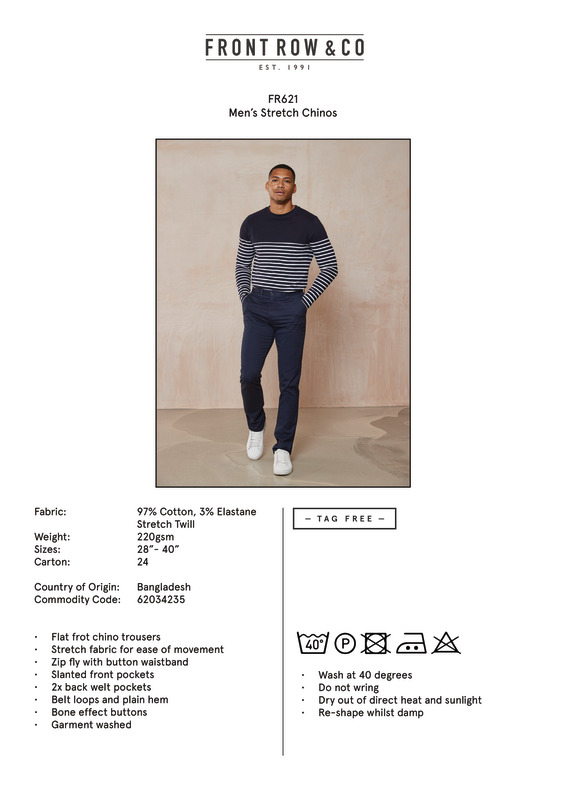The epitome of smart casual, Front Row's lightweight stretch chino range is for teams, clubs and workplaces. For brands looking to put their names to quality garments. For those who work hard and play harder. These flat front chinos are made with quality cotton-rich stretch twill, and are garment washed for a comfortable finish. Constructed with a YKK zip fly and buttoned waistband. Tag free for easy rebranding. Great looking leisurewear. Thoughtfully created.Flat front chino trouserTag freeStretch fabric for ease of movementSlanted front pockets, 2 back welt pockets, belt loops plain hemBSCI certified.Accreditations: Amfori BSCIAge Group: AdultFabric: 97% Cotton, 3% Elastane twillGender: MaleLeg Length: Leg length: Regular, LongPlus Size: NoProduct Type: ChinosSize Range: 28″ to 40″Sizing To Fit: 28″ 30″ 32″ 34″ 36″ 38″ 40″Tag: TaglessWashing Instructions: 40 synthetic. Wash Dark colours separately. Wash and dry Inside out. Use colour recommended detergent. Dry out of direct heat and sunlight. 2 dot Iron on reverse. Do not bleach, Do not tumble dry. P dry clean.Weight (GSM): 220gsm]]>