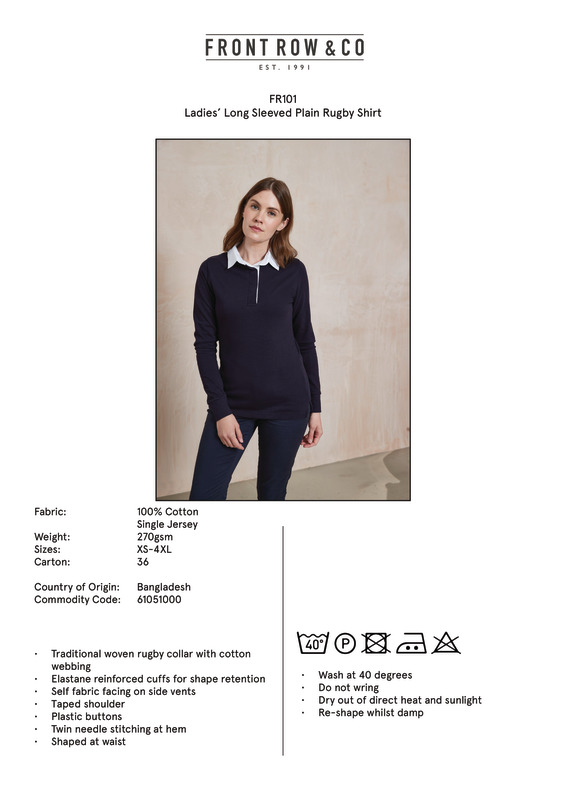 The long-sleeved plain rugby shirt has ample space to display a bold slogan, logo or crest making it perfect for everyone from fashion brands to traditional clubs. Made from 100% cotton it has a traditional woven rugby collar, shaped waist, self-fabric facing on side vents and elastane reinforced cuffs exemplary of the quality design detail Front Row is known for.Self-fabric facing on side ventsElastane reinforced cuffs for shape retentionTwin-needle hems and traditional rugby collar with cotton webbingSlimmer feminine fitDyed to match plastic buttonsWRAP CertificationRugby leisurewear garments are for leisure use onlyWRAP certified.Accreditations: WRAPAge Group: AdultFabric: 100% Cotton single JerseyGender: FemalePlus Size: YesProduct Type: PolosSize Exclusions: *XS, 3XL and 4XL only available in these coloursSize Range: XS to 4XLSizing To Fit: XS* 8 S 10 M 12 L 14 XL 16 2XL 18 3XL* 20 4XL* 22Tag: TaglessWashing Instructions: 40 cotton. Do not bleach. Low temp 2 dot iron. P dry clean. Wash at 40 degrees. Wash dark colours separately. Re-shape while damp. Do not leave folded when damp. Iron on reverse. Wash and Dry Inside Out. Dry out of direct heat and sunlight.Weight (GSM): 270gsm]]>