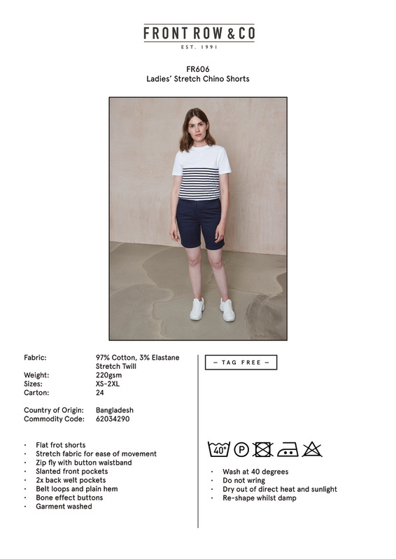 The epitome of smart casual, Front Row's lightweight stretch chino range is for teams, clubs and workplaces. For brands looking to put their names to quality garments. For those who work hard and play harder. These flat front chino shorts are made with quality cotton-rich stretch twill, and are garment washed for a comfortable finish. Constructed with a YKK zip fly and buttoned waistband. Tag free for easy rebranding. Great looking leisurewear. Thoughtfully created.Flat front chino shortTag freeStretch fabric for ease of movementSlanted front pockets2 x back welt pocketsBelt loopsPlain hemBSCI certified.Accreditations: Amfori BSCIAge Group: AdultFabric: 97% Cotton, 3% Elastane twillGender: FemalePlus Size: NoProduct Type: ShortsSize Range: XS to 2XLSizing To Fit: XS 26″ S 28″ M 30″ L 32″ XL 34″ 2XL 36″Tag: TaglessWashing Instructions: 40 synthetic. Wash Dark colours separately. Wash and dry Inside out. Use colour recommended detergent. Dry out of direct heat and sunlight. 2 dot Iron on reverse. Do not bleach, Do not tumble dry. P dry clean.Weight (GSM): 220gsm]]>