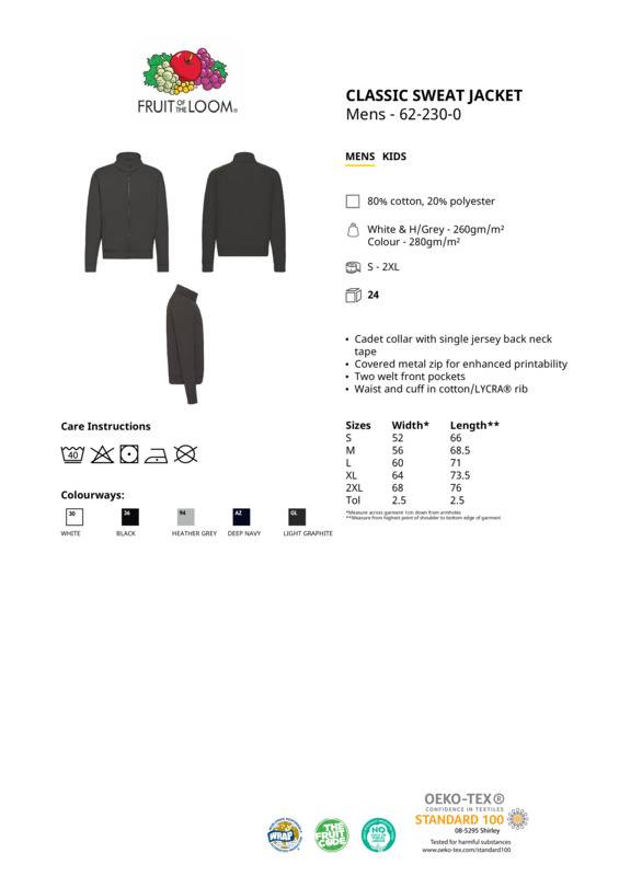 With its covered metal zip for enhanced printability and two welt front pockets for multipurpose use, the classic sweat jacket is ideal for all kinds of garment decoration. Details include a single Jersey back neck tape for comfort and cotton/Lycra® waist and cuff ribs and a cadet collar for added warmth.Covered zip for enhanced printabilityTurtleneck collar with single jersey back neck tapeNarrow full length zip and two jetted front pocketsAlso available in kidsWRAP certified.Accreditations: Oeko-Tex|WRAPAge Group: AdultFabric: 80% Cotton, 20% PolyesterGender: MalePlus Size: NoProduct Type: SweatshirtsSize Exclusions: *3XL only available in these coloursSize Range: S to 3XLSizing To Fit: S 35/37″ M 38/40″ L 41/43″ XL 44/46″ 2XL 47/49″ 3XL* 50/52″Tag: Sewn TagWashing Instructions: Machine wash 40°. Do not bleach. Tumble dry low. 1 dot iron. Do not dry cleanWeight (GSM): 280gsm]]>