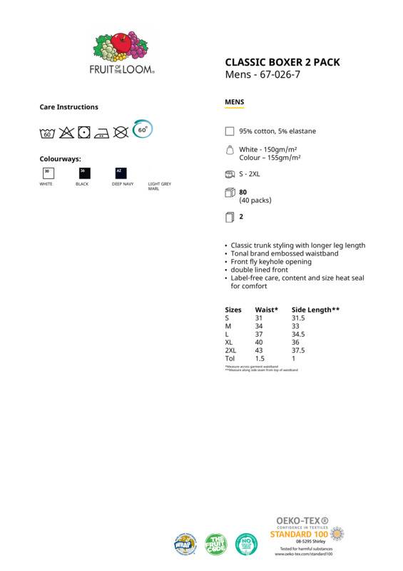 With a double lined front, front fly keyhole opening and classic trunk styling with longer leg length, Fruit’s classic boxer 2 Pack offers a relaxed fit for easy movement and everyday comfort. Details include label-free care, content and size heat seal and a tonal brand embossed waistband. This easy-care garment is available in 4 colours and is guaranteed to perform at a 60° wash.Trunk style with a longer leg lengthFront fly keyhole openingTonal brand embossed waistbandClassic coloursHeatseal inside waist labelAll underwear is non-returnableWRAP certified.Accreditations: Oeko-Tex|WRAPAge Group: AdultFabric: 95% Cotton, 5% ElastaneGender: MalePlus Size: NoProduct Type: BoxersSize Range: S to 2XLSizing To Fit: S 30/32″ M 33/35″ L 36/38″ XL 39/41″ 2XL 42/43″Tag: TaglessWashing Instructions: Machine wash 40°. Do not bleach. Tumble dry low. 2 dot iron. Do not dry cleanWeight (GSM): White 150gsm, Colours 155gsm]]>