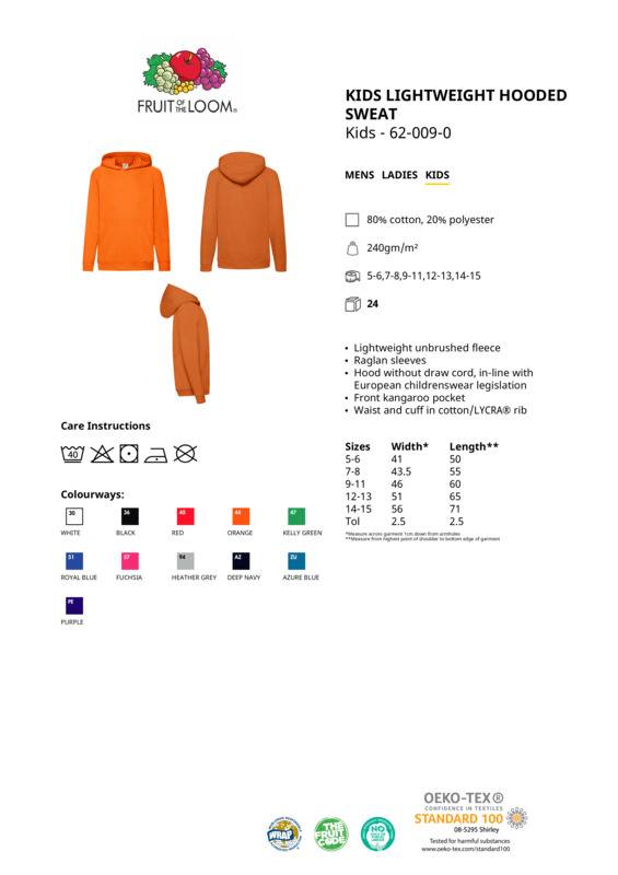 Made using unbrushed fleece and featuring raglan sleeves, the kids lightweight hooded sweat is perfect for layering, with a 100% cotton face promising perfect printing and embroidery results. The front kangaroo pocket and hood without drawcord – in-line with European childrenswear legislation – ensure a safe and comfortable wear, while form-fitting cotton/Lycra® rib cuffs help provide added warmth.Kids Lightweight unbrushed (French Terry) Sweatshirt with raglan sleevesHood without draw cord, in-line with European childrenswear legislationFront pouch pocketWaist and cuff in cotton/Lycra® ribWRAP certified.Accreditations: Oeko-Tex|WRAPAge Group: KidsFabric: 80% Cotton, 20% PolyesterGender: UnisexPlus Size: NoProduct Type: HoodiesSize Exclusions: * Size 14/15 is VATableSize Range: 5/6 to 14/15Sizing To Fit: 5/6 26″ 7/8 28″ 9/11 30″ 12/13 32″ 14/15 34″Tag: Sewn TagWashing Instructions: Warm machine wash. Do not bleach.Tumble dry. Cool iron.Do not dry clean.Weight (GSM): 240gsm]]>