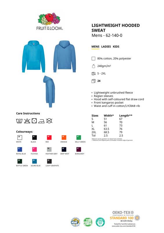 Made using unbrushed fleece and featuring raglan sleeves, the lightweight hooded sweatshirt is perfect for layering, with a 100% cotton face promising perfect printing and embroidery results. The sweatshirt also features a front kangaroo pocket and hood with self-coloured flat drawcord.Lightweight unbrushed fleeceRaglan sleevesHood with self-coloured flat draw cordFront pouch pocketWaist and cuff in cotton/Lycra® ribWRAP certified.Accreditations: Oeko-Tex|WRAPAge Group: AdultFabric: 80% Cotton, 20% PolyesterGender: MalePlus Size: NoProduct Type: HoodiesSize Range: S to 2XLSizing To Fit: S 35/37″ M 38/40″ L 41/43″ XL 44/46″ 2XL 47/49″Tag: Sewn TagWashing Instructions: Machine wash 40°. Do not bleach. Tumble dry low. 1 dot iron. Do not dry cleanWeight (GSM): 240gsm]]>
