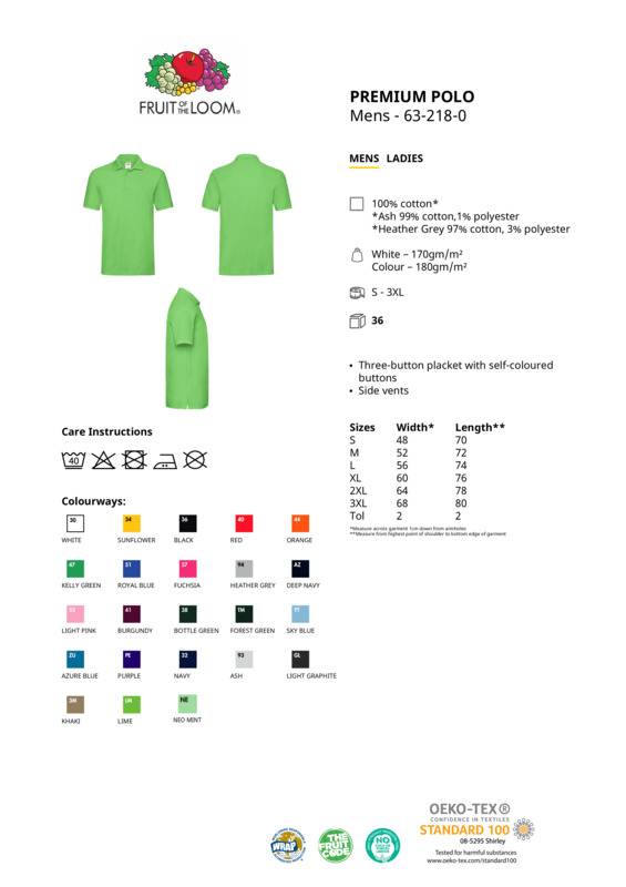 Ideal for work, hospitality, event, leisure or casual wear, the Premium polo features side vents for easy movement. This shirt is classically styled with a 3-button placket and self-coloured buttons and is available in a wide range of colours – so you can make the Premium polo yours, anyway you want.Three-button placket with self-coloured buttons.Accreditations: Oeko-Tex|WRAPAge Group: AdultFabric: 100% Cotton. Ash: 90% Cotton, 10% PolyesterGender: MalePlus Size: YesProduct Type: PolosSize Range: S to 3XLSizing To Fit: S 35/37″ M 38/40″ L 41/43″ XL 44/46″ 2XL 47/49″ 3XL 50″Tag: Sewn TagWashing Instructions: Machine wash 40°. Do not bleach. Do not tumble dry. 2 dot iron. Do not dry cleanWeight (GSM): White 170gsm, Colours 180gsm]]>