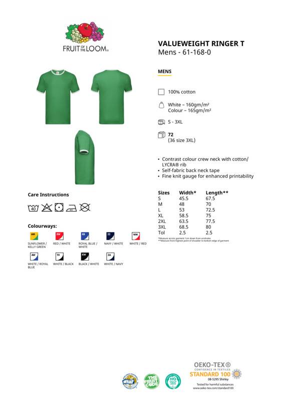 Featuring a contrast colour crew neck and arm trim with a cotton/Lycra® rib, the Valueweight ringer T combines a classic look with a contemporary tailored fit that’s ideal for retail, licensing and tourism. Made from 100% cotton with a fine knit gauge for enhanced printability, you can make the Valueweight ringer T yours, anyway you want.Contrast neck and cuff ribCotton/Lycra® rib crew neck with taped neckline for comfortShoulder-to-shoulder tape for added comfortTwin needle stitching details on neck, sleeves and hemWRAP certified.Accreditations: Oeko-Tex|WRAPAge Group: AdultFabric: 100% CottonGender: MalePlus Size: NoProduct Type: T-ShirtsSize Range: S to 3XLSizing To Fit: S 35/37″ M 38/40″ L 41/43″ XL 44/46″ 2XL 47/49″ 3XL 50/52″Tag: Sewn TagWashing Instructions: Machine wash 40°. Do not bleach. Tumble dry low. 2 dot iron. Do not dry cleanWeight (GSM): White 160gsm, Colours 165gsm]]>