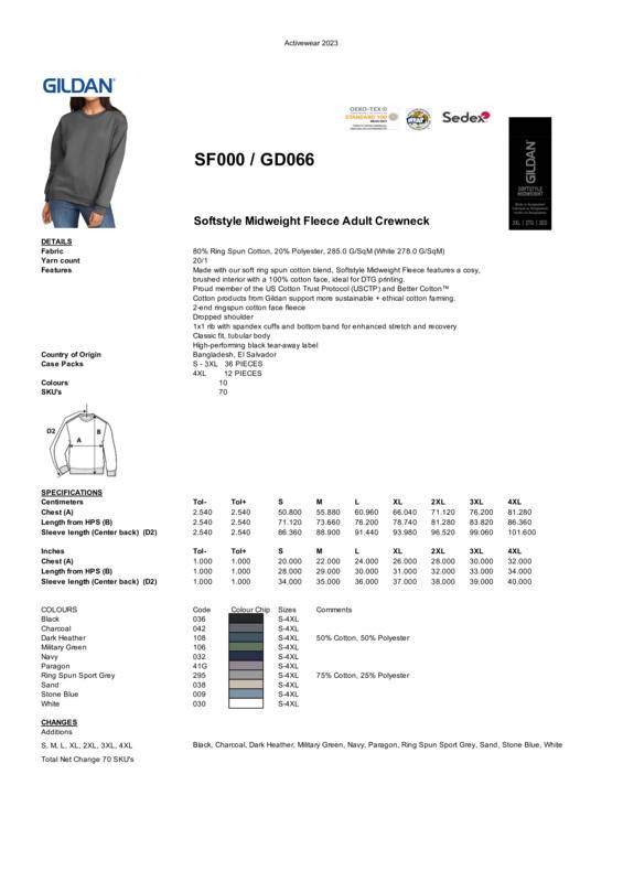 A perfect combination of stylish design and practical detail. This amazing 80/20 cotton blend sweatshirt has a 100% cotton face so that it prints perfectly every time. Ideal for DTG, but equally suitable for all other types of decoration, including screen printing, discharge and embroidery.Made with our soft ringspun cotton blend, the Softstyle™ midweight fleece adult crew neck features a cosy, brushed interior with a 100% cotton face, ideal for DTG printingTwo-end ringspun cotton face fleeceTwo-piece, colour-matched, Jersey fabric-lined hoodDropped shoulderPouch pocket1x1 rib with Spandex cuffs and bottom band for enhanced stretch and recoveryClassic fit, tubular bodyHigh-performing black tear-away label.Accreditations: SEDEX|WRAP|Fair Labour Association (FLA) |Better Cotton|Oeko-Tex Standard 100|REACHAge Group: AdultFabric: 80% Ringspun Cotton, 20% PolyesterGender: UnisexPlus Size: YesProduct Type: SweatshirtsSize Range: S – 4XLSizing To Fit: S 34/36″ M 38/40″ L 42/44″ XL 46/48″ 2XL 50/52″ 3XL 54/56″ 4XL 58/60″Tag: Tear-awayWashing Instructions: Machine wash 30°C. Use non-chlorine bleach. Do not iron. Tumble dry on low heat. Do not dry clean.Weight (GSM): 285gsm. White: 278gsm]]>