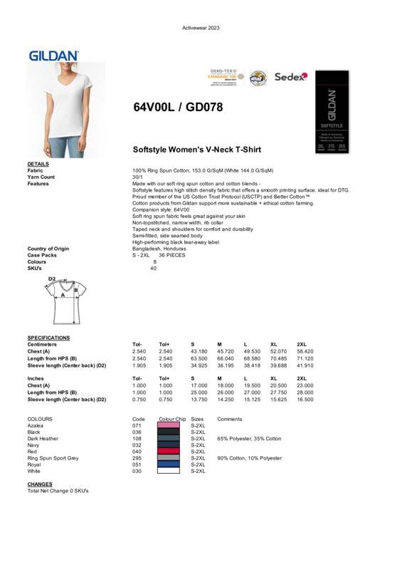 This trim, feminine v-neck tee makes an instantly favourable impression, thanks to quality that’s apparent from the very first glance. Crafted of premium ringspun yarns, the Jersey fabric has an exceptionally touchable hand and flattering drape as well as a smooth face that lends itself to embellishment.Fitted silhouette with side seamHigh stitch density for smoother printing surfaceTearaway label1.3cm mitered v-neck collarTaped neck and shouldersTwin-needle sleeve and bottom hems.Accreditations: SEDEX|WRAP|Fair Labour Association (FLA) |Better Cotton|Oeko-Tex Standard 100|REACHAge Group: AdultFabric: 100% Ringspun Cotton. Sport Grey: 90% Ringspun cotton, 10% Polyester. All Heathers: 35% Cotton, 65% PolyesterGender: FemalePlus Size: YesProduct Type: T-ShirtsSize Range: S to 2XLSizing To Fit: S 6/8 M 8/10 L 12 XL 14 2XL 16Tag: Sewn TagWashing Instructions: Machine wash warm. Inside out, with like colours. Only non-chlorine bleach. Tumble dry medium. Do not iron if decorated. Do not dry cleanWeight (GSM): White 144gsm, Colours 153gsm]]>