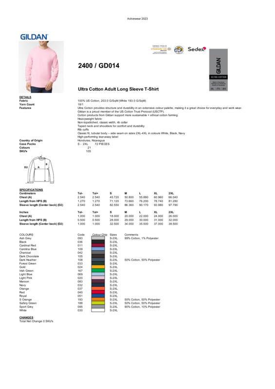 In the t-shirt world, this Gildan® Ultra Cotton™ long sleeve tee is a true classic. The fabric is heartier and thicker than most – a full 200gsm of 100% cotton softness and strength. Neat rib cuffs and a twin-needle bottom hem look neat and last long. Take advantage of the fabric heft and density to make any sort of imprint or embroidery looks its best.100% cotton pre-shrunk jersey knitSeamless twin needle 7/8″ collarTaped neck and shouldersRib cuffsTwin needle bottom hemQuarter turned to eliminate centre creaseUltra tight knit surface, excellent for screen print and embroideryTearaway label.Accreditations: SEDEX|WRAP|Fair Labour Association (FLA) |Better Cotton|USCTP|Oeko-Tex Standard 100|REACHAge Group: AdultFabric: 100% US Cotton. Ash: 99% US Cotton, 1% Polyester. Dark Heather, Safety Green, Safety Orange: 50% US Cotton, 50% Polyester. Sport Grey: 90% US Cotton, 10% PolyesterGender: UnisexPlus Size: NoProduct Type: T-ShirtsSize Exclusions: *3XL only available in these colours. †4XL and 5XL only available in these coloursSize Range: S to 5XLSizing To Fit: S 34/36″ M 38/40″ L 42/44″ XL 46/48″ 2XL 50/52″ 3XL* 54/56″ 4XL† 58/60″ 5XL† 62/64″Tag: Sewn TagWashing Instructions: Machine wash warm. Inside out, with like colours. Only non-chlorine bleach. Tumble dry medium. Do not iron if decorated. Do not dry cleanWeight (GSM): White 193gsm, Colours 203gsm]]>