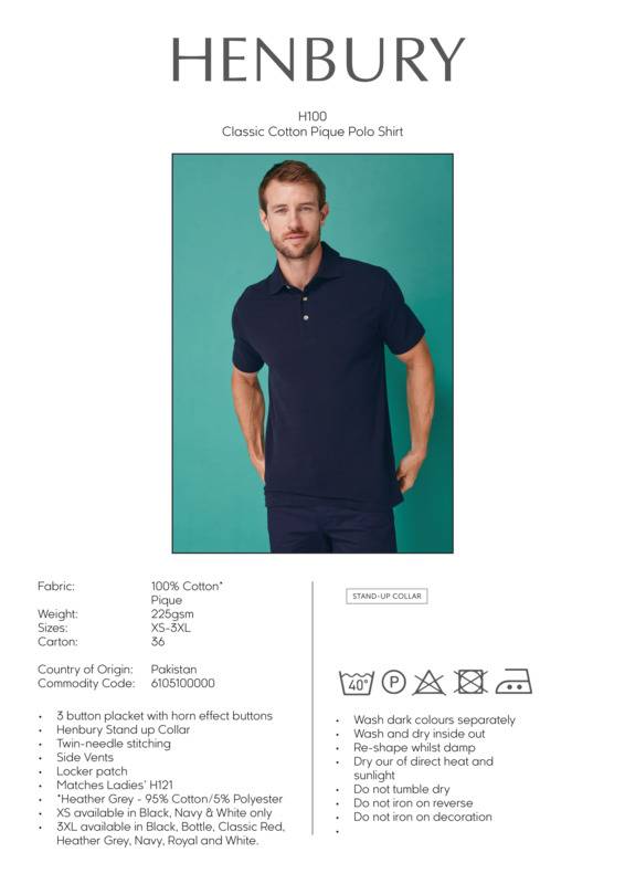 Back to the beginning. This was the first polo shirt Henbury introduced and it is still performing today as it did then. Its classic features supply that traditional corporate look our customers know and love.Classic 3 button placket with plain horn buttonsStand-up collar for increased shape retentionSide vents for ease of movementHemmed sleeves, locker patchWorlwide Responsible Accredited Production (WRAP) certified productionWRAP certified.Accreditations: WRAPAge Group: AdultFabric: 100% Ringspun cotton. Heather Grey: 95% Cotton, 5% PolyesterGender: MalePlus Size: YesProduct Type: PolosSize Exclusions: *3XL only available in these colours, †XS only available in these coloursSize Range: XS to 3XLSizing To Fit: XS† 34/36″ S 36/38″ M 38/40″ L 42″ XL 44/46″ 2XL 48″ 3XL* 50/52″Tag: Sewn TagWashing Instructions: 40 cotton. Do not bleach. Do not tumble dry. 2 dot iron. P dry clean. Wash at 40 degree's. Wash dark colours separately. Re-shape while damp. Dry out of direct heat and sunlight. Do not tumble dry. Iron on reverse. Wash and dry inside out. Do not iron on decoration.Weight (GSM): 225gsm]]>