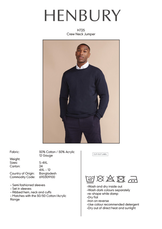 The traditional crew neck jumper that is known for its exceptional quality and durability. This style is part of our 50 cotton/50 acrylic range where you can mix and match your styles.Fine knit12 gauge crew neck jumperSemi fashion neck detailSet-in-sleeves1x1 rib and cuffSEDEX certifiedOeko-Tex certifiedBSCI certified.Accreditations: Amfori BSCI|Oeko-Tex|SedexAge Group: AdultFabric: 50% Cotton, 50% AcrylicGender: MalePlus Size: YesProduct Type: Knitted JumpersSize Range: S to 4XLSizing To Fit: S 36/38″ M 38/40″ L 42″ XL 44/46″ 2XL 48″ 3XL 50/52″ 4XL 54″Tag: Sewn TagWashing Instructions: Do not bleach. Do not tumble dry. 2 dot iron. Do not dry clean. Wash at 40 degrees. Wash dark colours separately. Wash and dry inside out. Dry flat. Use colour recommended detergent. Re-shape while damp. Dry out of direct heat and sunlight. Iron on reverse.Weight (GSM): 12 Gauge]]>